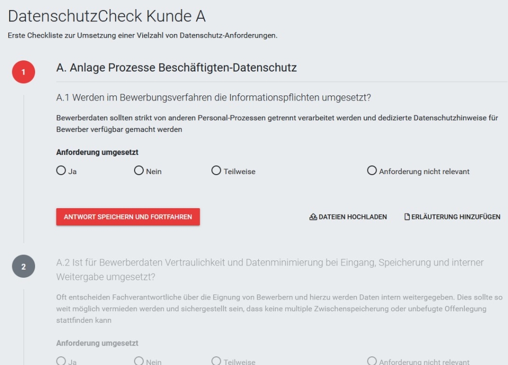 Das Produkt umfasst eine Checkliste (131 Fragen) zum Datenschutz-Umsetzungsstand mit kurzen Erläuterungen.