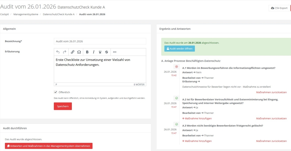 Damit können Sie in DPMS ein Management-System anlegen, Bestandsaufnahmen oder Audits durchführen, Selbst-Checks für Kunden online zur Verfügung stellen und anhand der Antworten individuelle Maßnahmen erstellen (DPMS Funktionen).