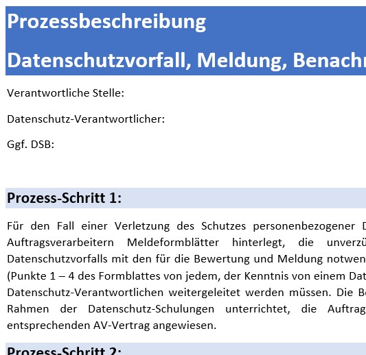 - Muster "Prozessbeschreibung Datenschutzvorfall" (anpassbare Prozessdokumentation intern/für die Aufsichtsbehörde)